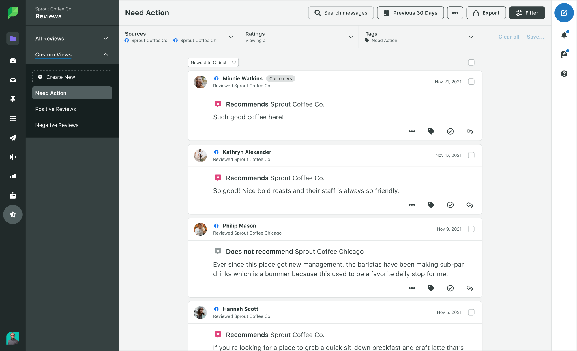 Simplify your review strategy by opting for a social solution that takes multiple platforms into account. Sprout Social’s review management tool unifies reviews from Facebook, Glassdoor, TripAdvisor and Google My Business into one view to simplify your response process.